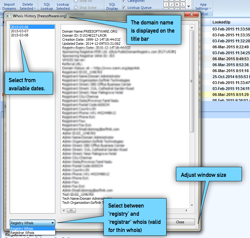To view older whois records, right click on a domain name and select View Raw Whois History.